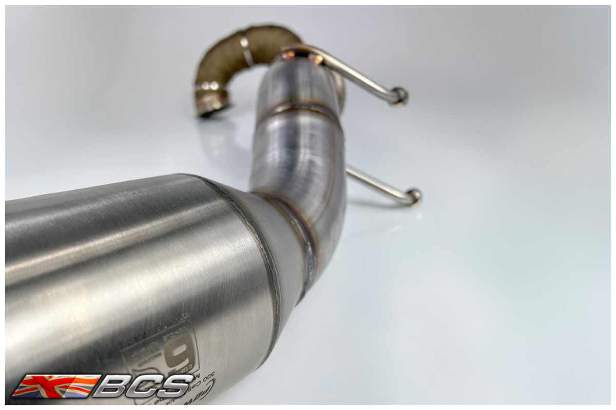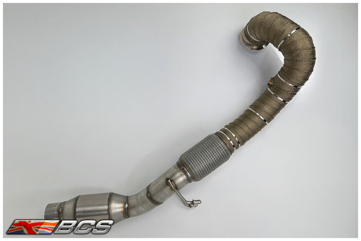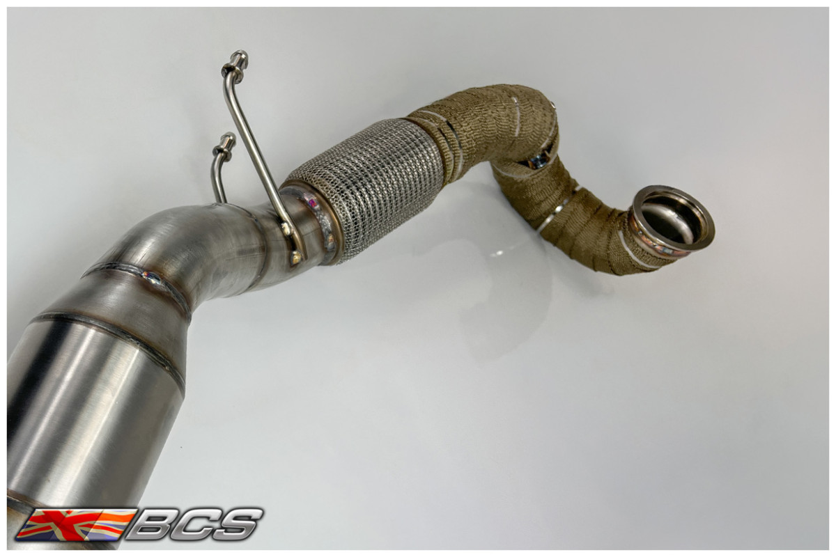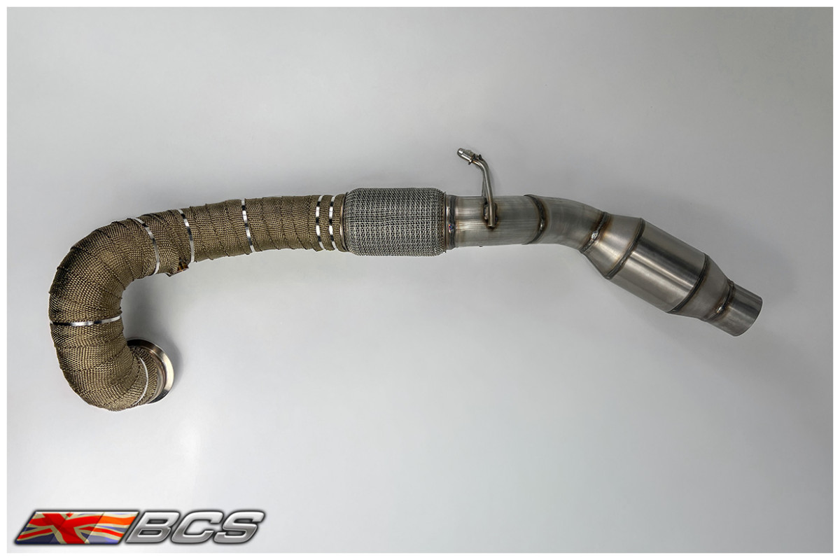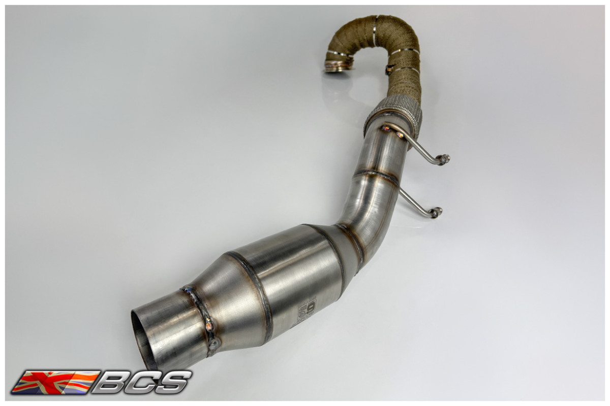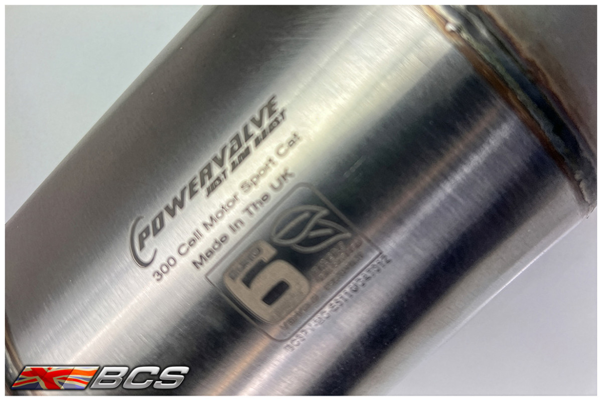 The BCS Powervalve Downpipe and 4.5" 300cell Sport Cat is the ideal hardware upgrade when considering a power increase as well as a sound enhancement for the 2.0 TSI Engine. This Hardware upgrade unlocks greater performance potential and delivers an audible uplift in sound, producing a sporty, crisp exhaust tone without unwanted drone. The Downpipe features a 90mm collector directly off the turbo flange, this unique feature acts as a funnel and better matches the direct force from the turbo resulting in less restriction compared to 76mm directly off the turbo. Paired with the Euro 6 regulated 4.5" 300cell Sports cat the downpipe offers full MOT and Emissions compliance without performance compromising as this downpipe will support 380bhp.