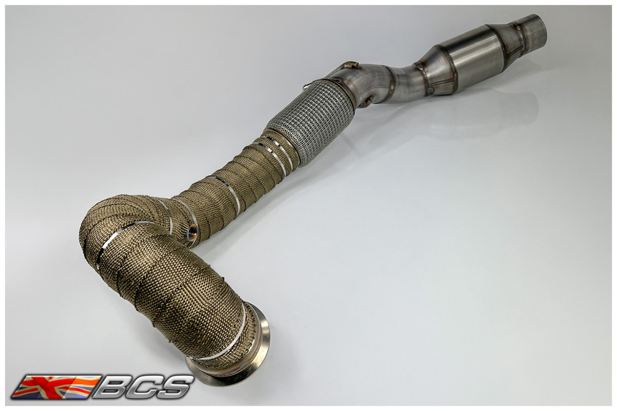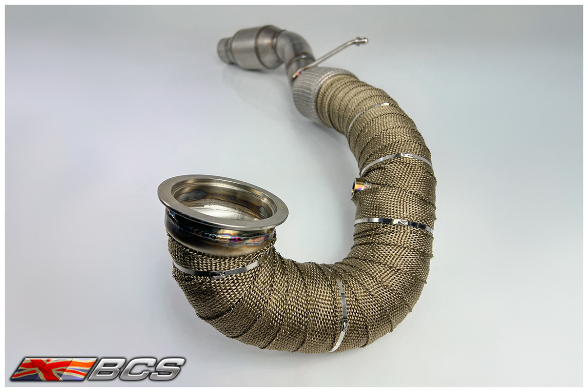 Thermal Protection comes as standard and you have the option of a Ceramic Coating or a Basalt lava rock Titanium Wrap, Both are excellent at containing heat inside the downpipe and forcing it down into the catalyst away from the engine bay ultimately resulting in cooler engine bay temperatures and greater thermal efficiency inside the catalyst units themselves. The Ceramic Coating is 1000℃ and the Titanium Wrap is 1200℃, the difference is minimal and ultimately choice comes down to personal aesthetic preference but we'd recommend the Titanium Wrap for Track vehicles.